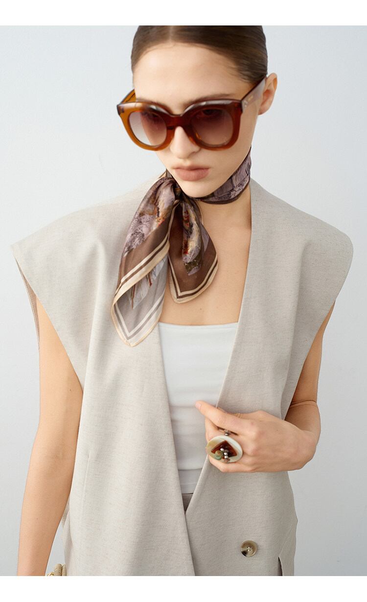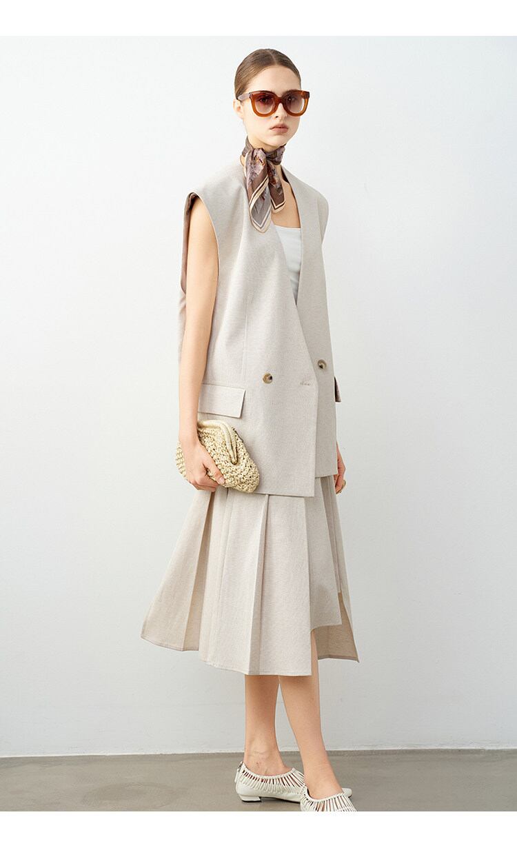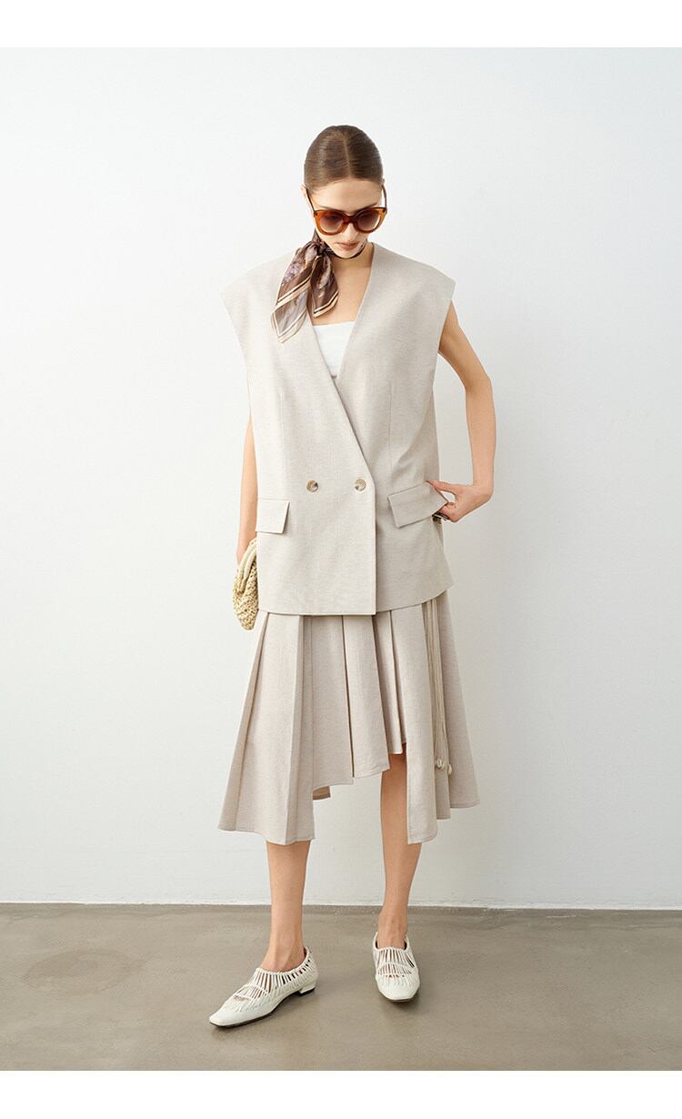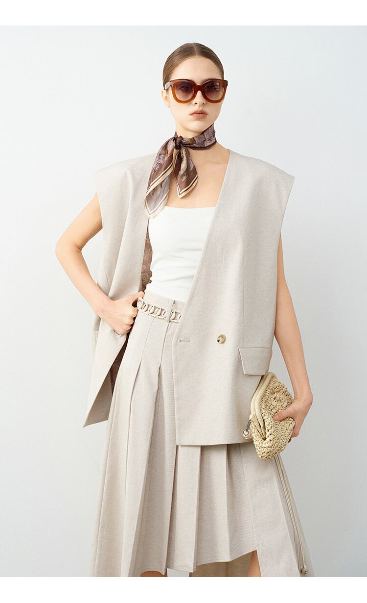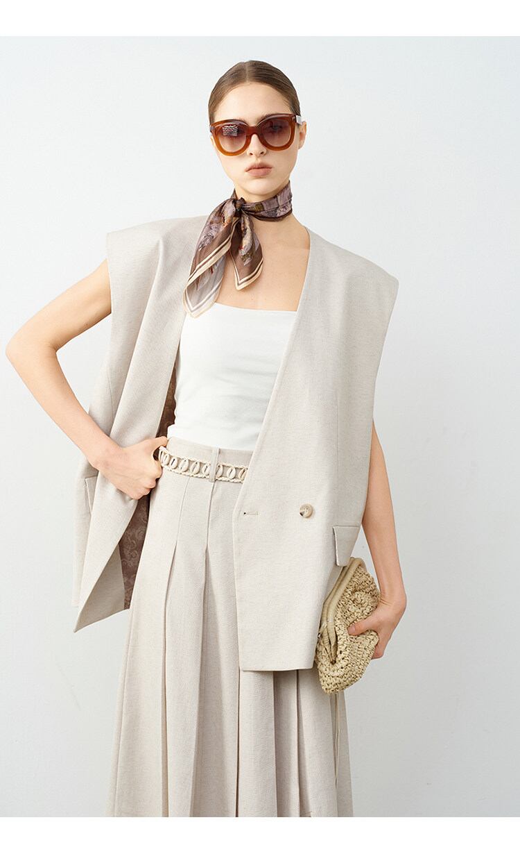 シンプルでありながらエレガントな雰囲気を持つこのベストは、何にでも合わせやすいデザインが特徴です。