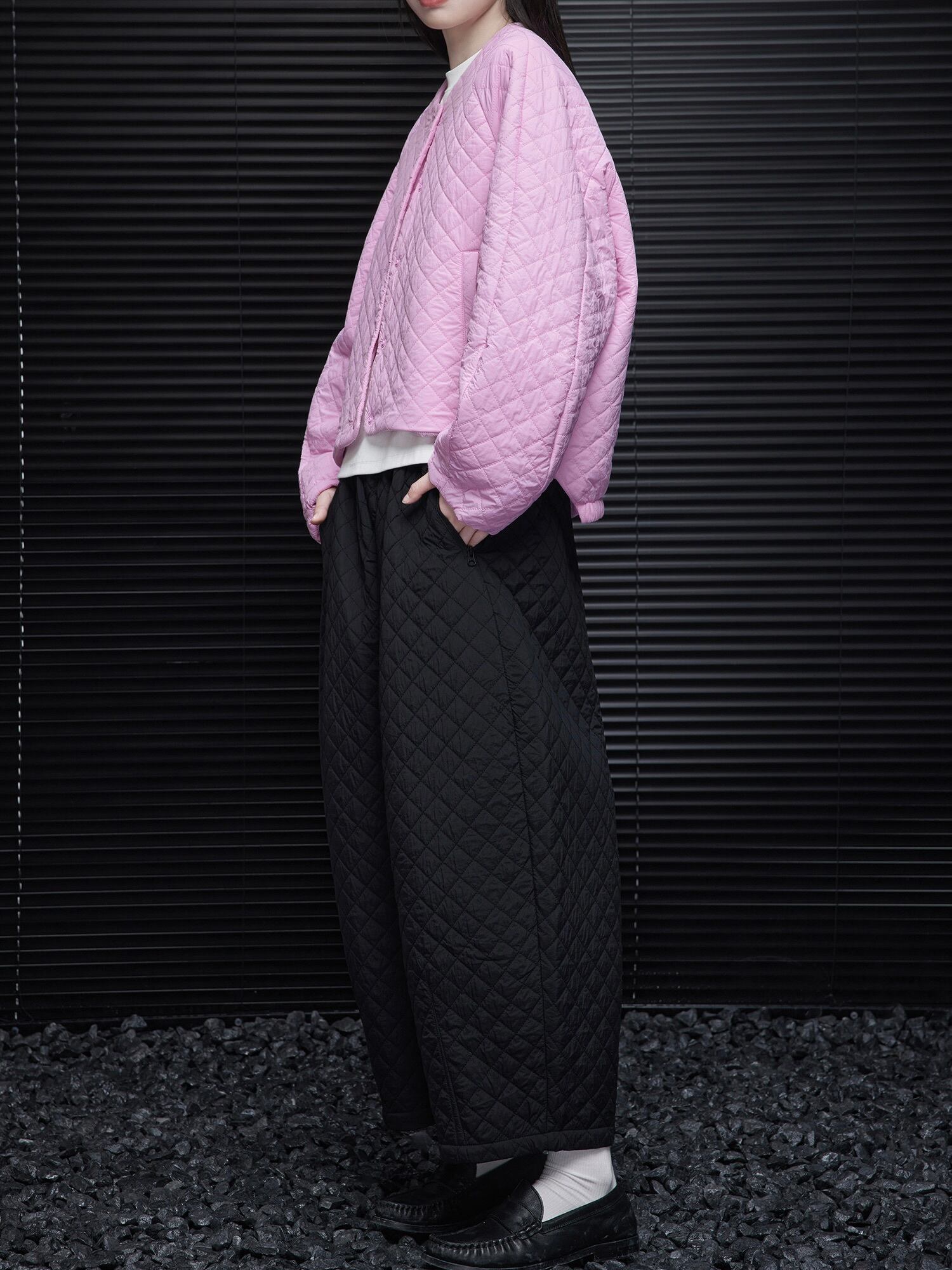 軽やかな素材感と、全体を包み込むようなキルティングデザインが特徴のこのジャケットは、綺麗なシルエットを表現。