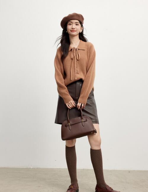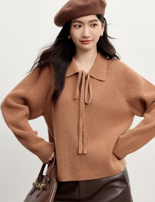 春にぴったりなニットで、エレガントなリボン付きの襟が特徴です。