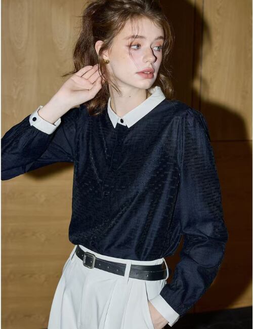 洗練されたデザインと高級感のある光沢感が魅力の「Contrast Collar Blouse」。かっちりとした仕立てが美しいシルエットを生み出し、きっちりとした印象を与えます。ビジネスシーンでもよそゆきの場でも重宝する一着です!