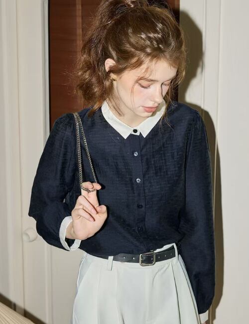 **光沢感漂う「Contrast Collar Blouse」が新登場!**
