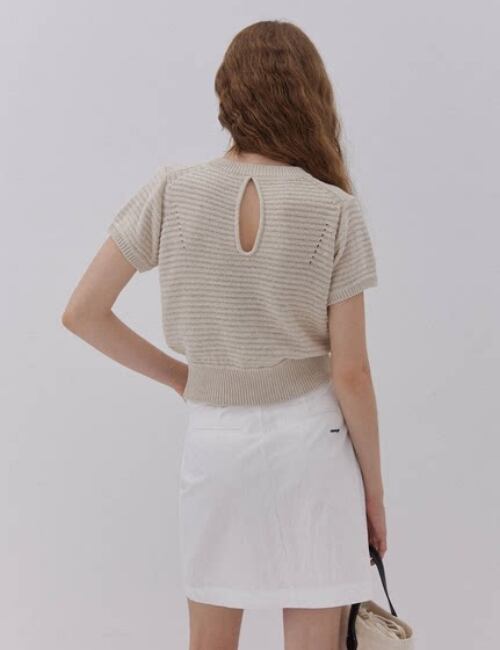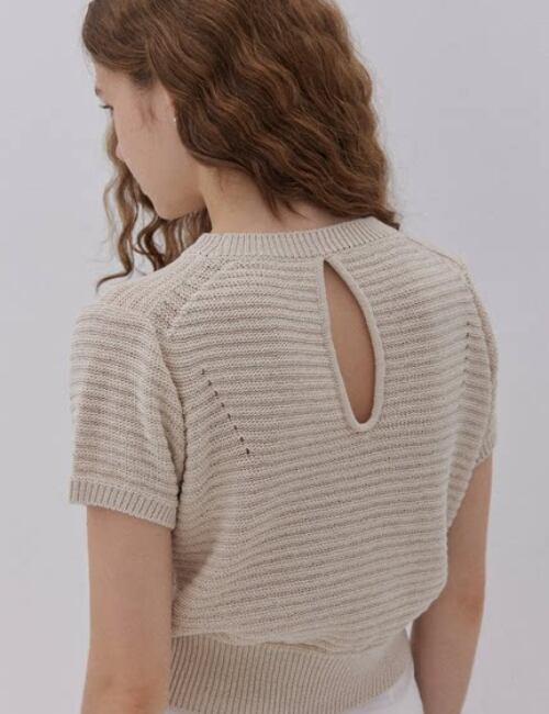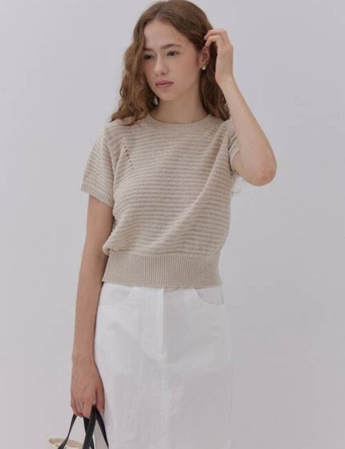 落ち着き感のあるテクスチャーとストライプデザインが特徴で、短めのトップスとしてスタイリングの幅を広げてくれます。