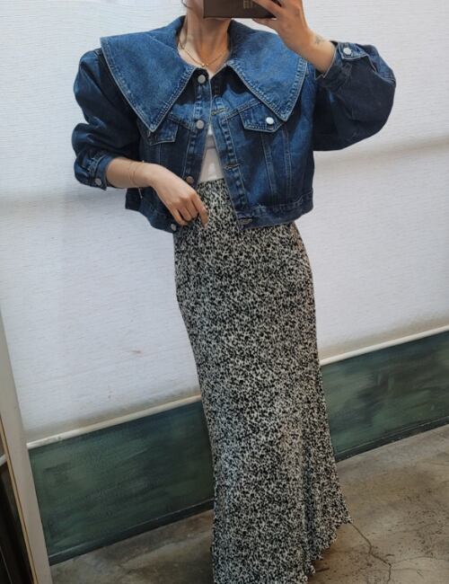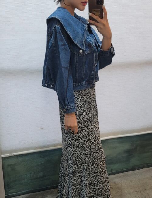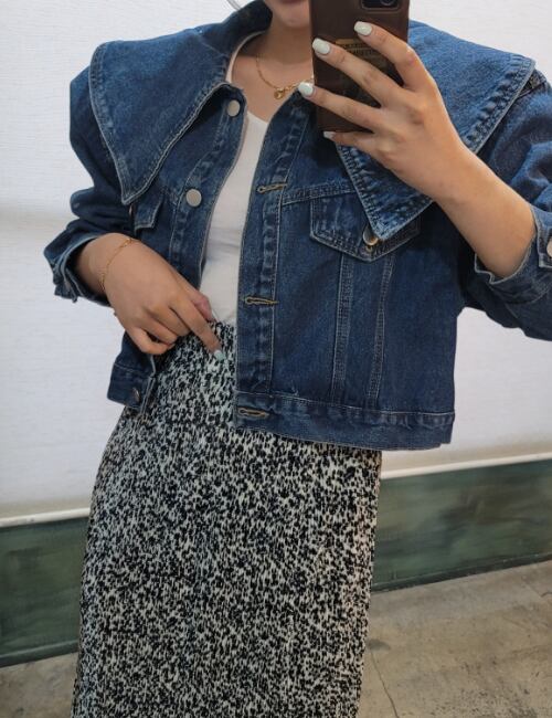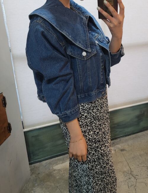 大きな襟が特徴的で、小顔効果を引き出しつつ、ショート丈が脚長の印象を与えます。