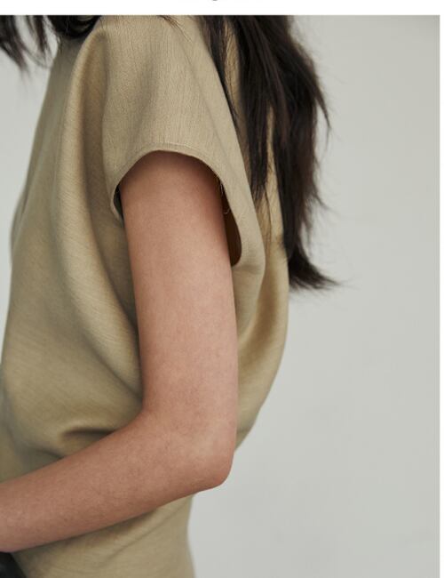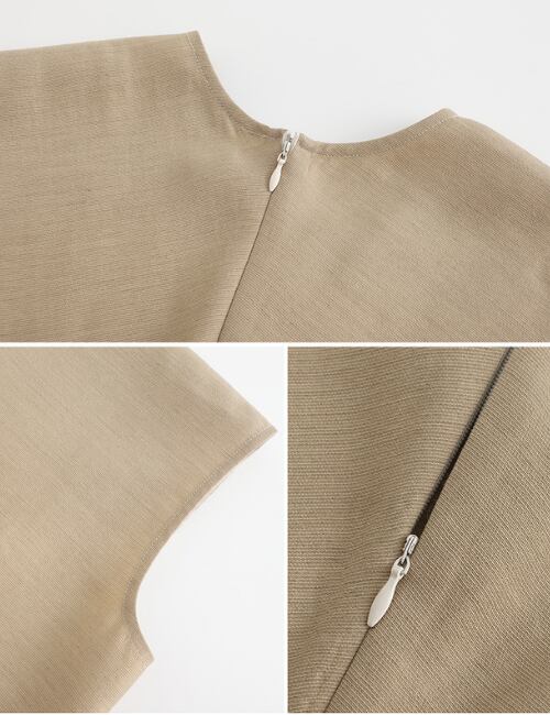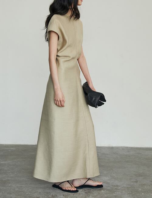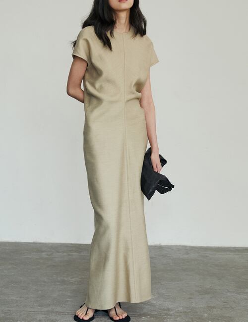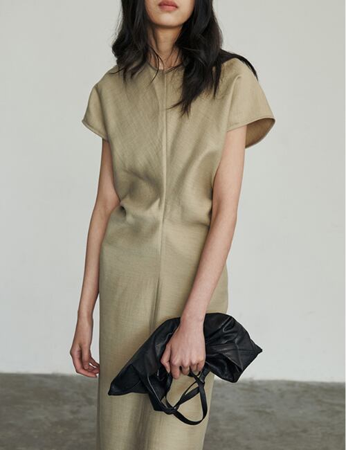 抜け感のあるカプスリーブが、女性らしい柔らかさを演出し、飽きのこないミニマルなデザインが一層引き立っております。